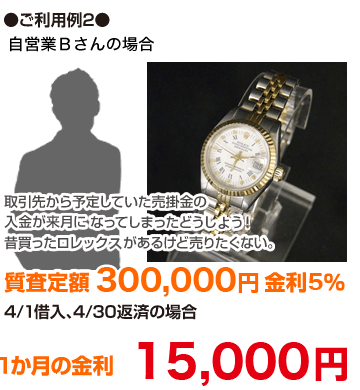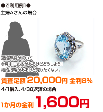 ・3ヶ月の間に、元金+質料をお支払いいただき、お預かりしたお品物をお返しします。 ・3ヶ月を超える場合も1ヶ月分の質料をお支払いいただければ、1ヶ月間の延長が可能です。 ・また、返済の変わりに、商品を手放す(質流れ)ことも可能です。