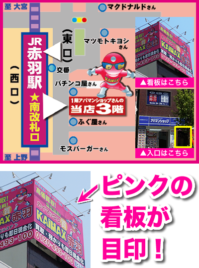 赤羽駅下車、南改札口を出て、右へ出るとやや斜め前のビルを見上げてください! ピンクの大きな看板が目に飛び込んで来るはずです。
